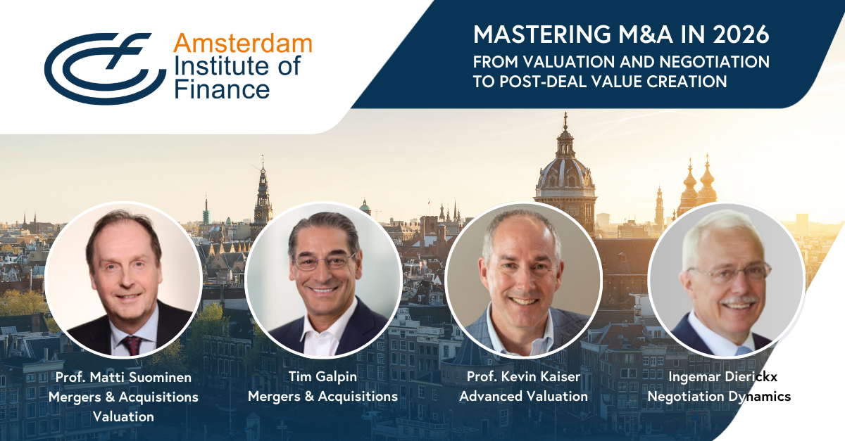 The deal environment is becoming more complex. Digital disruption, shifting regulation, tighter capital markets, and more demanding stakeholders raise the bar on how you source, price, negotiate, and integrate transactions. That is why Amsterdam Institute of Finance brings together a focused portfolio of executive programs for professionals who want to operate with more rigor and confidence across the deal cycle.